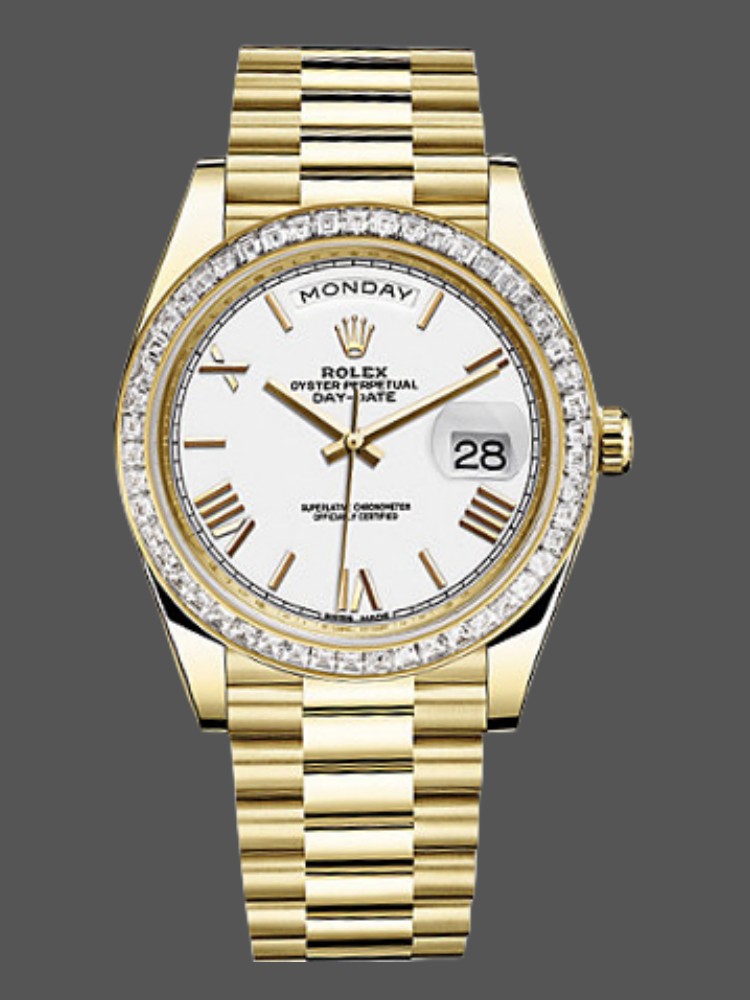 Rolex Day-Date 228398TBR White Roman Numeral Dial Diamond Bezel 40mm Mens Replica Watch